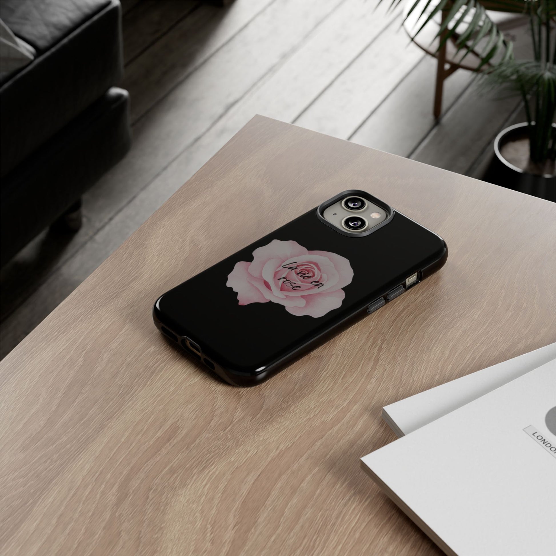 A sleek, protective phone case that pairs delicate floral art with tough, everyday protection. The soft pink rose blooms against a deep black background, with subtle handwritten text at its center — an understated, romantic touch that reads like a private note. Lightweight but robust, the dual-layer construction keeps your phone safe from drops while the glossy or matte finish keeps the design vivid. This case slips into a commuter bag or a nightstand drawer with equal grace, adding a quiet, elegant accent to daily life.